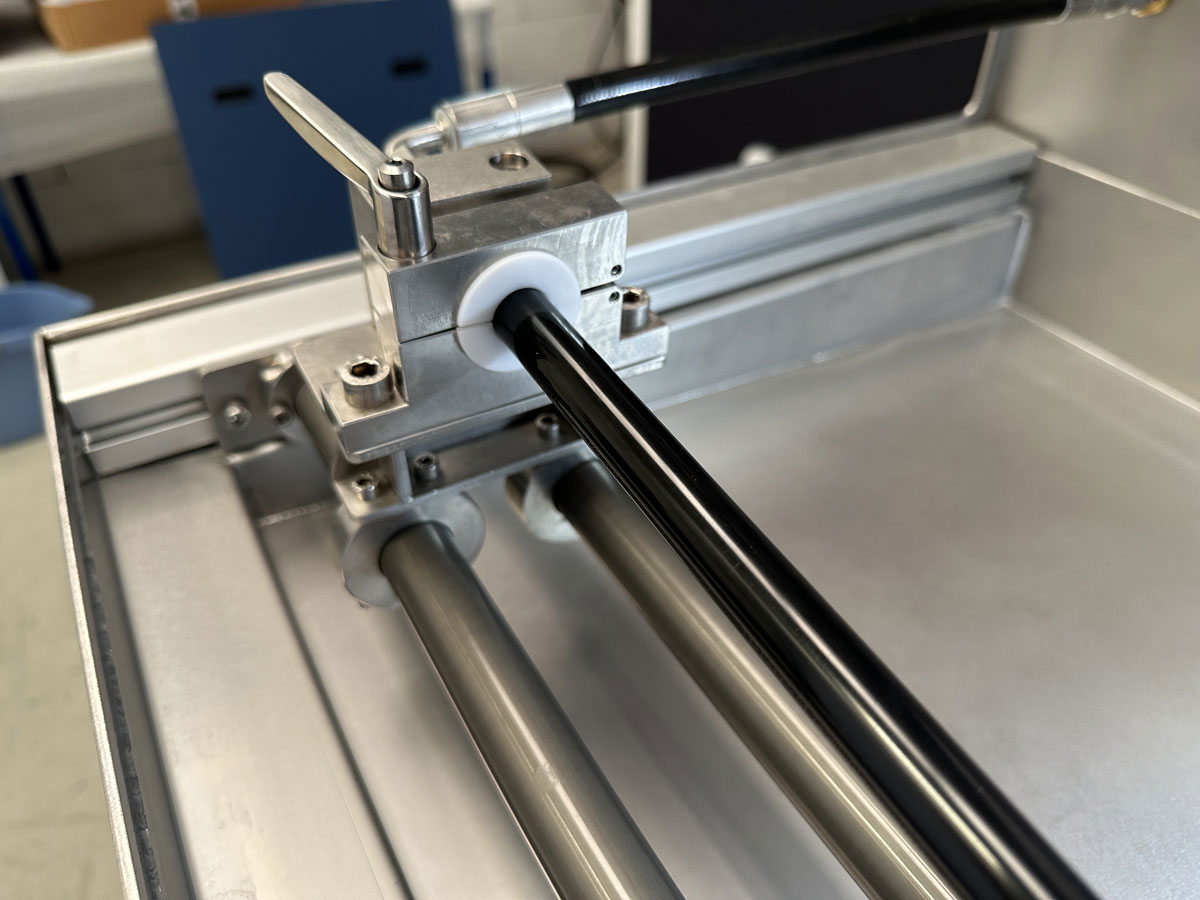 Le tube testé est raccordé à des outillages à connexion rapide. Ces outillages sont montés sur chariots mobiles pour s’adapter à la longueur du tube.