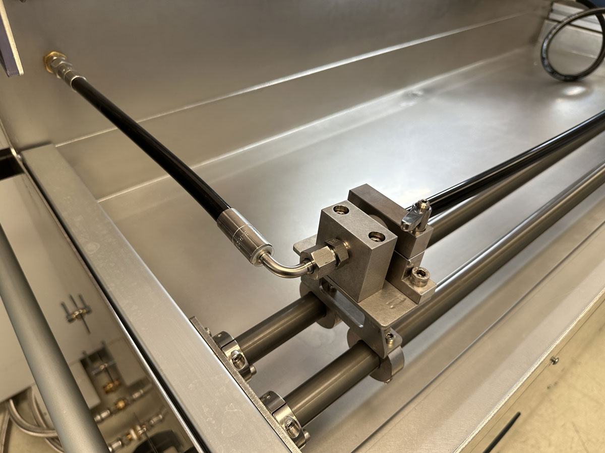 Le volume interne de la seringue est dimensionné pour couvrir une large gamme de volumes d’expansion des produits testés. Et en cas de volume supérieur, la machine est équipée d’une vanne automatique, permettant de maintenir la pression dans le tube le temps que la seringue se remplisse à nouveau.