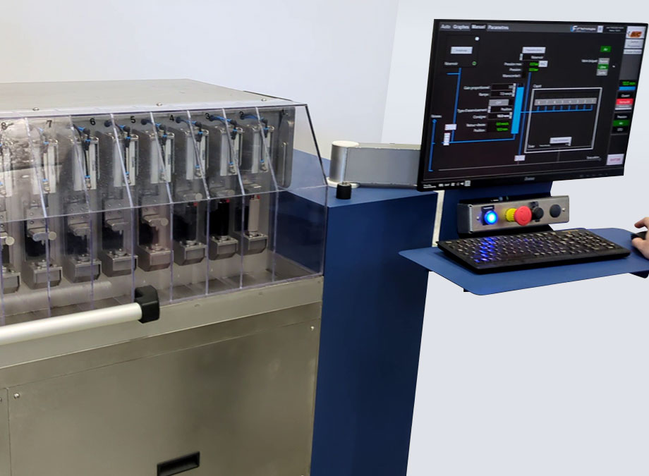 Mise en place des produits dans l’enceinte sécurisée et paramétrage des pressions souhaitées via l’interface de commande. -